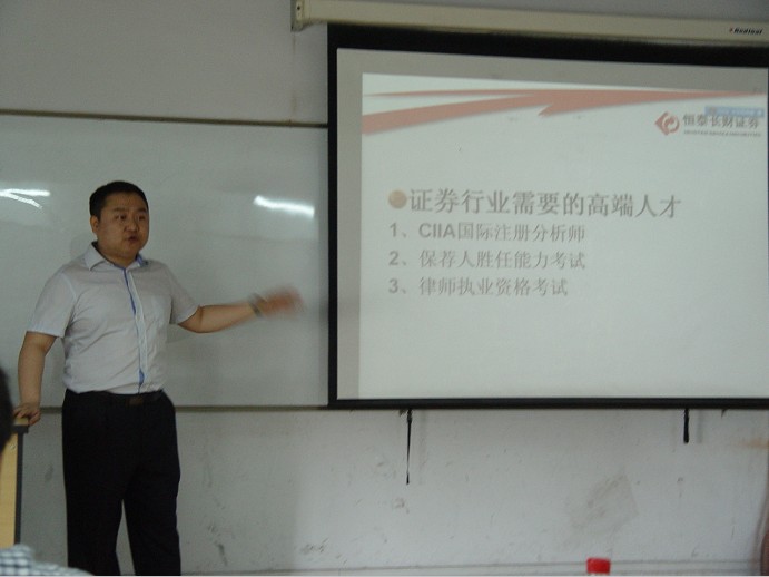 经济贸易学院举办恒泰长财证券首席讲师专题报告会 2013年6月26日,经济贸易学院邀请长春市恒泰长财证券首席讲师潘奕霖及首席技术分析师吴鹏为best3652011和2012级投资学专业学生做了关于就业和证券投资相关专业知识的专...