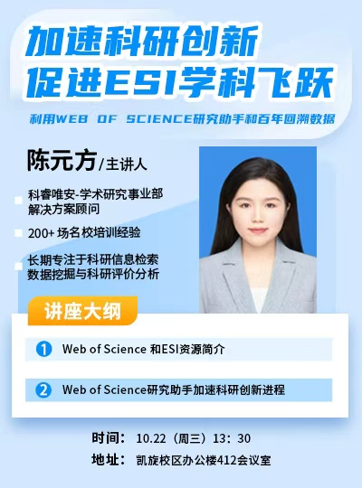 主讲人:陈元方,科睿唯安公司 解决方案顾问时间、地点:2025年10月22日13:30,凯旋校区办公楼412主办单位:科研处讲座内容:1.Web of Science 和ESI资源简介;2.Web of Science研究助手加速科研创新进程。