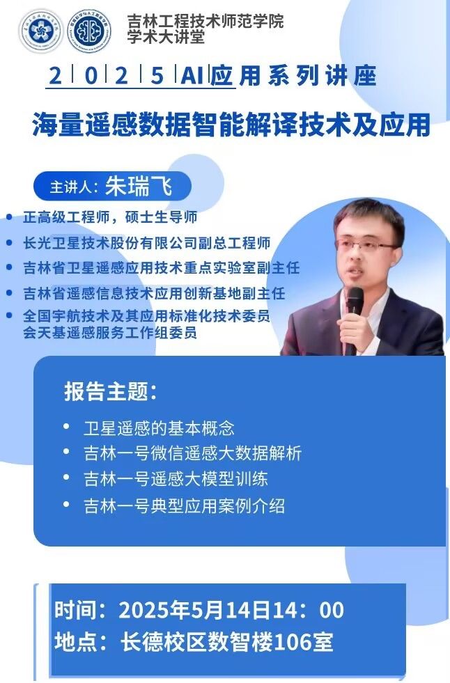 主讲人:朱瑞飞,长光卫星技术股份有限公司 正高级工程师时间、地点:2025年5月14日14:00, 长德校区数智楼106主办单位:数据科学与人工智能学院、科研处讲座内容:1.卫星遥感的基本概念;2.吉林一号遥感大数据;3.吉林一号遥感大模型;4.吉林一号典型应用案例。