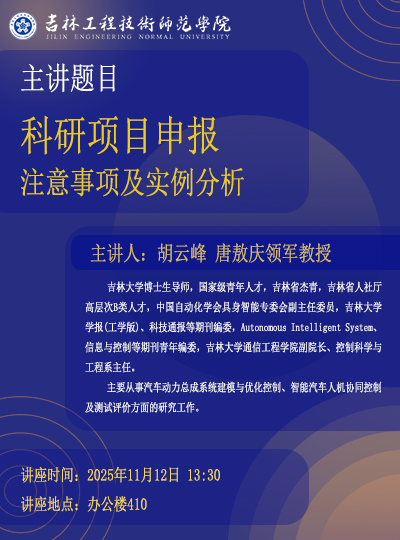 主讲人:胡云峰,吉林大学 唐敖庆领军教授时间、地点:2025年11月12日13:30 ,凯旋校区办公楼410主办单位:科研处讲座内容:1.项目评审过程;2.申报书撰写注意事项;3.实例分析。