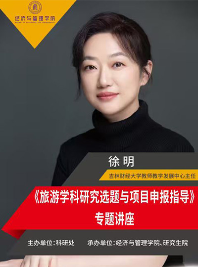 主讲人:徐明,吉林财经大学 教授时间、地点:2025 年 10 月 11 日13:00,凯旋校区第一教学楼 311主办单位:经济与管理学院、科研处讲座内容:1.旅游学科的发展现状与趋势;2.确定旅游学科研究选题的方法路径;3.项目申报的技巧与指导。